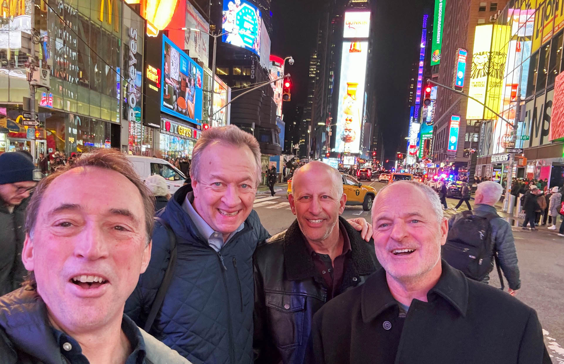 Snakes in Times Square! Matt Wiant ’84, Jaan Janes ’85, Dave Anapolle ’84, and Steve O’Leary ’84.